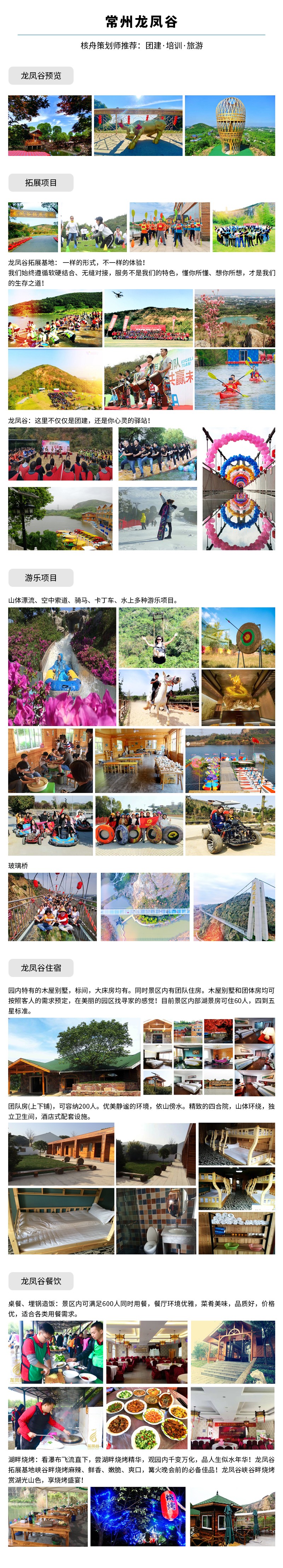 常州龍鳳谷拓展基地是景區發展核心板塊,擁有上百種團建項目,獨立草坪15塊,最大草坪可容納2000人活動,是企業拓展訓練活動、團隊建設、公司旅游、慶典、會議、年終晚會、企業培訓、游樂、自駕游、度假、親子游、夏令營、冬令營、春游、秋游及公司各種主題活動的最好的去處! 努力打造華東線上最好的拓展基地!同時龍鳳谷風景區內搭配用餐、住宿、會議室等配套設施,滿足各類需求。