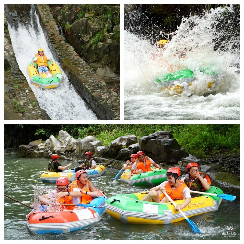 熱身過后,小伙伴們迅速帶好安全帽,穿上救生衣全副武裝,蓄勢待發(fā)……工作人員陸續(xù)將一艘艘漂流船放入水中,大家兩人一組,帶上船槳,馬上開始這段驚險刺激的漂流行程啦!隨著河道落差所產(chǎn)生的沖擊力,一艘艘小船飛馳而過,水花聲、尖叫聲此起彼伏……整個過程有驚無險,即使也會出現(xiàn)傾覆的情況,我們的小伙伴都能彼此照應(yīng),一同克服,重新將小船入水。