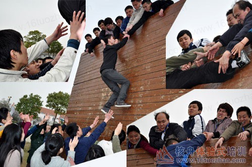 光溜溜的木板,“畢業(yè)墻”有4米高,24人,要用多長時(shí)間全部翻越過去,而且不得借助任何工具。一開始大家覺得很難,估計(jì)最少要用40分鐘的時(shí)間。結(jié)果年齡大的、年齡小的、男的、女的、胖的、瘦的,一古腦兒僅用了18分鐘的時(shí)間就全部翻越過了。嘩,團(tuán)隊(duì)的力量,太神奇了!這不是簡單的1+1=2,而是遠(yuǎn)遠(yuǎn)大于2。