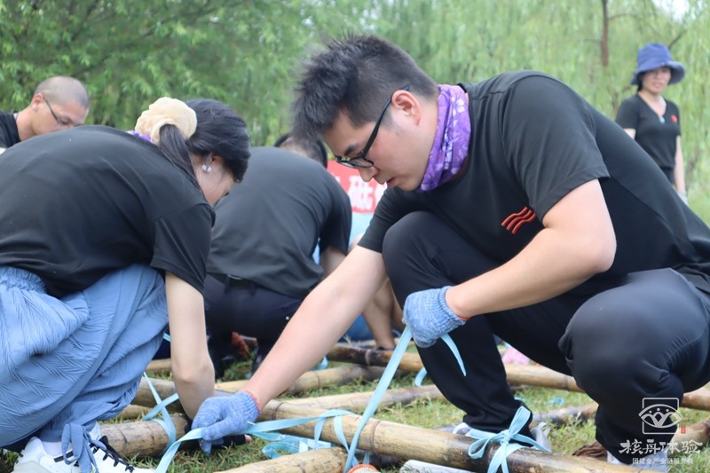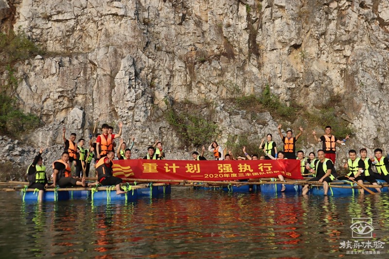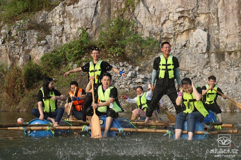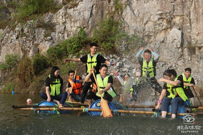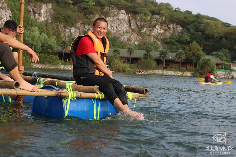 在青山綠水之間,在充滿陽光氣息的青草地上和樹蔭下,團隊成員一起討論方案一起動手,扎好一只漂亮的竹筏,舉行隆重的下水儀式。